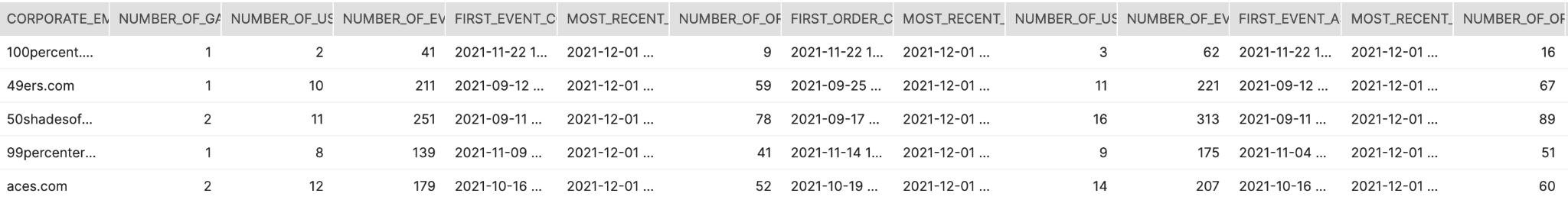 We also aggregate information on the entire Gaggle, including users who don’t have a company domain. This is found in the CTE named gaggle_total_facts.