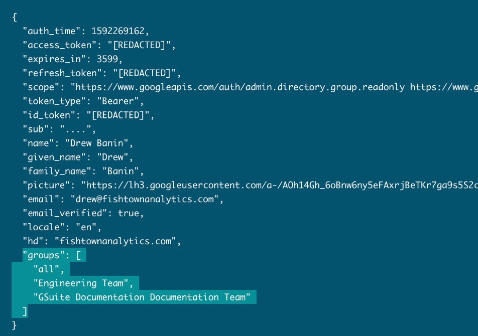 4. On the Credentials page, verify that a groups entry is present, and that it reflects the groups you are a member of in GSuite. If you do not see a groups entry in the IdP attribute list, consult the following Troubleshooting steps.