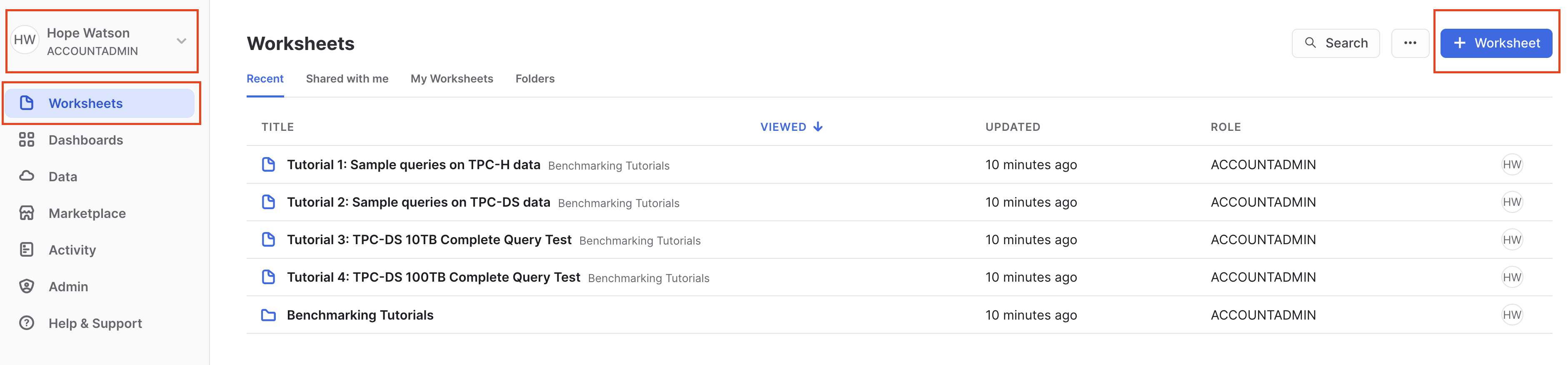 When Snowsight first opens, your window should look like the following, with you logged in as the ACCOUNTADMIN with demo worksheets open: